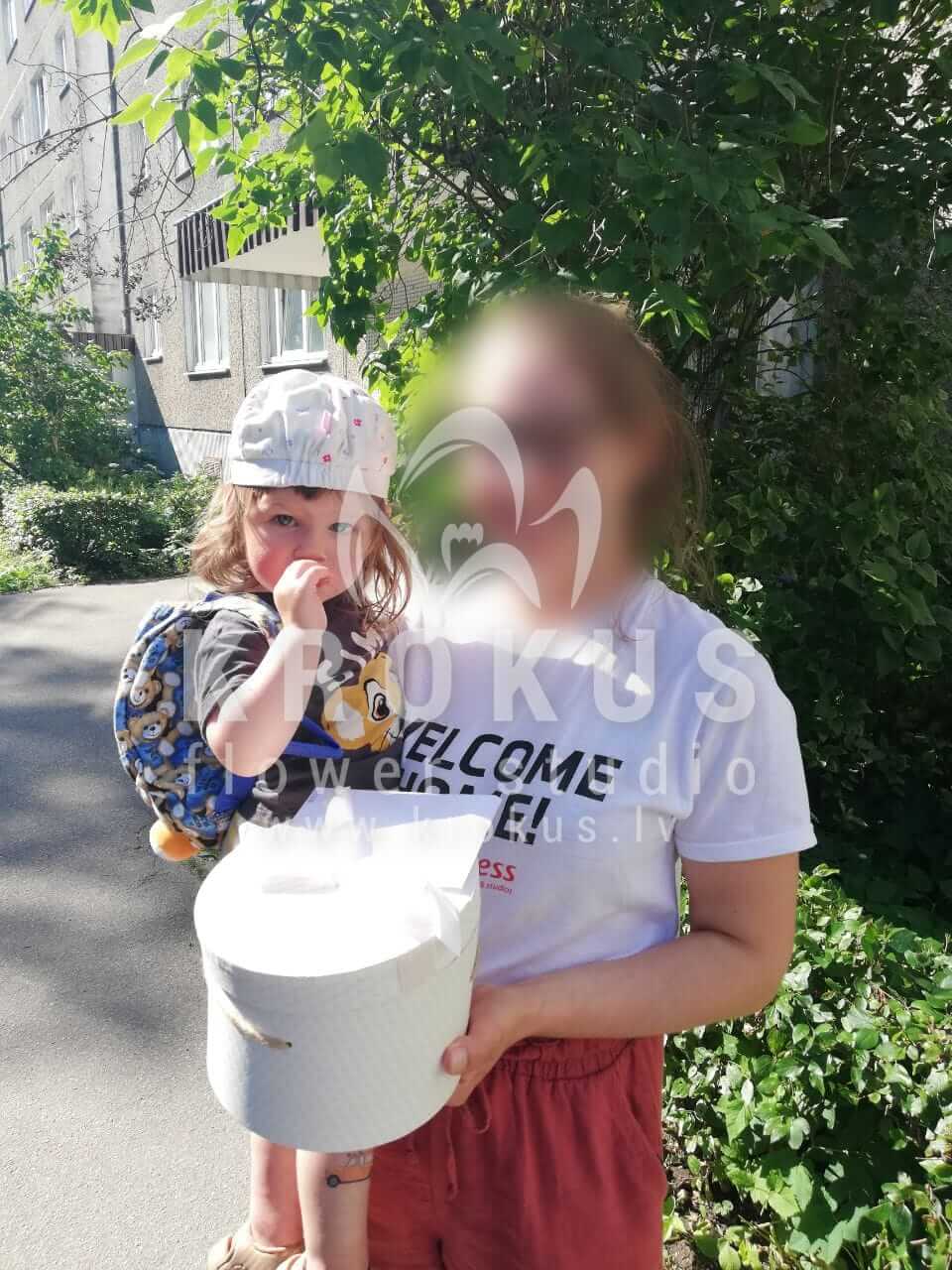Mēs piegādājām vēl vienu pasūtījumu uz pilsētu Rīga. Pasūtītājs vēlējās: Ziedu piegāde Flowerbox ar makarūniem (macaroon) (Izmērs: