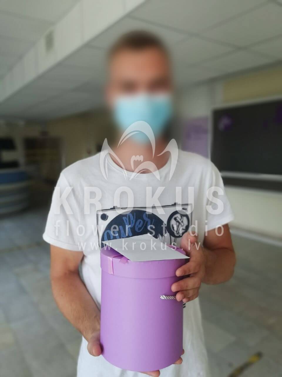 Mēs piegādājām vēl vienu pasūtījumu uz pilsētu Rīga. Pasūtītājs vēlējās: Ziedu piegāde Flowerbox ar macarooniem (Izmērs: