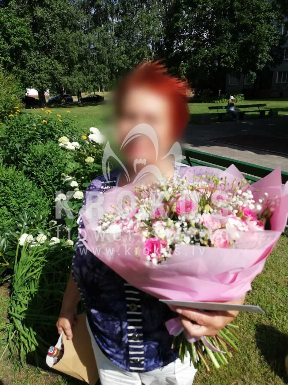 Ziedu sastāvā: Rozā rozes, Krūmrozes, Lizantes, Veronika, Tulpes, Gypsophila (Ģipsene), Ruskuss.