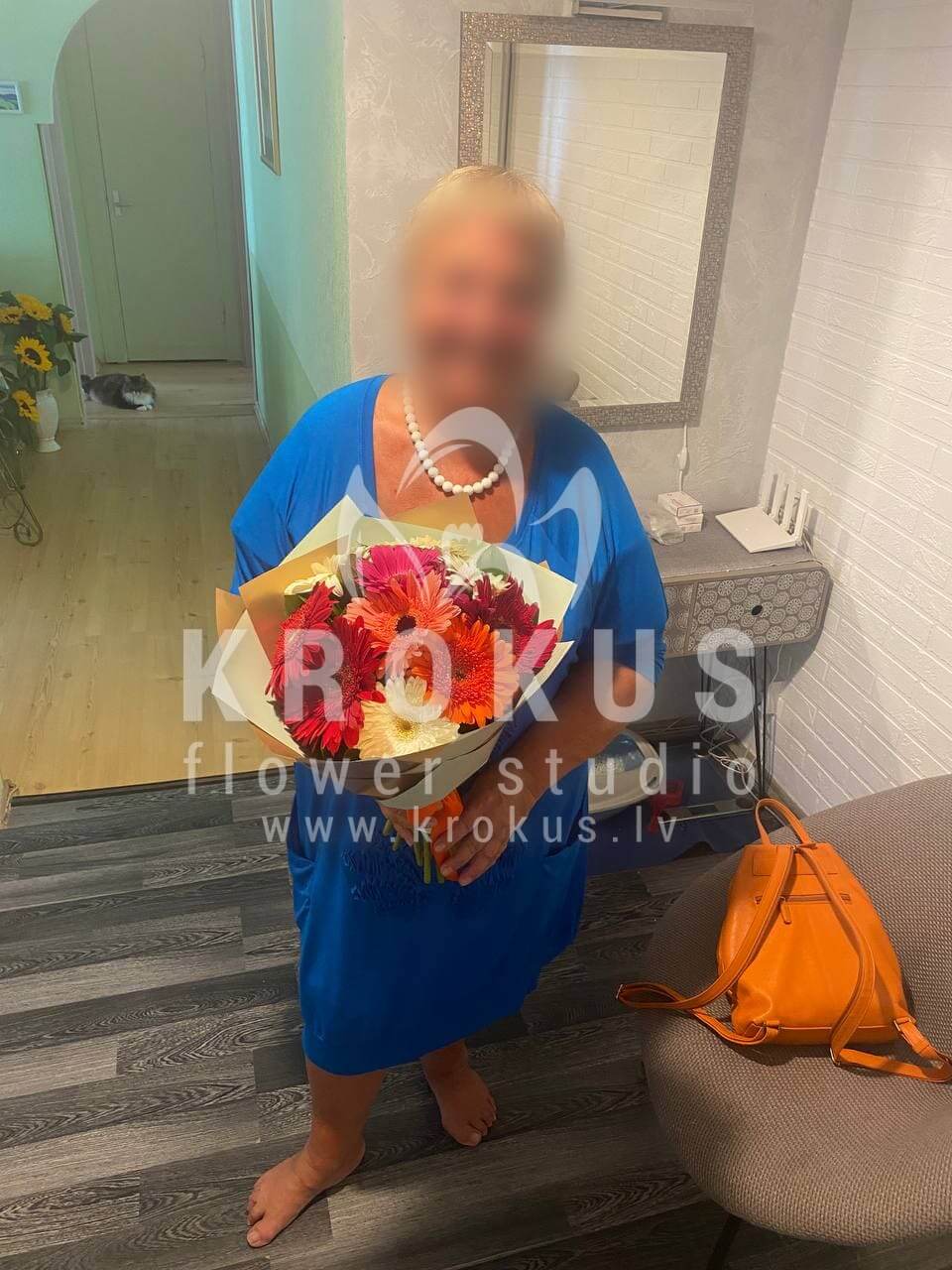 Mēs piegādājām vēl vienu pasūtījumu uz pilsētu Rīga. Pasūtītājs vēlējās: Ziedu piegāde Gerberu pušķis "Saulīte" (Kādu krāsu gerberas tik nav! Šiku ziedu pušķi mēs esam radījuši no dažādu krāsu gerberām. Sarkanām, rozā, oranžām, violetām un baltām. Šīs ir spilgtas, piesātinātas krāsas. Saulainā lente ir harmonijā ar pamata fona pušķi un saglabā savu eleganto tēlu. Jūtat pacilājošu garastāvokli? Un pasaule radīs varavīksni ap Jums!!!)