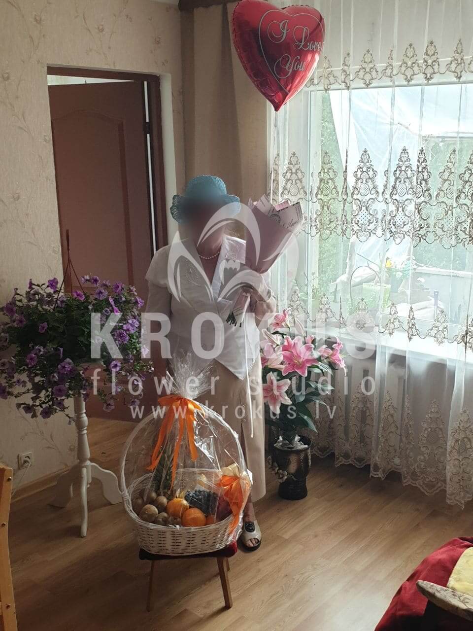 Mēs piegādājām vēl vienu pasūtījumu uz pilsētu Rīga. Pasūtītājs vēlējās: Ziedu piegāde Rozā rozes 50cm. Ziedu piegāde Folija Balons sirds 18x45cm. Ziedu piegāde Augļu grozs