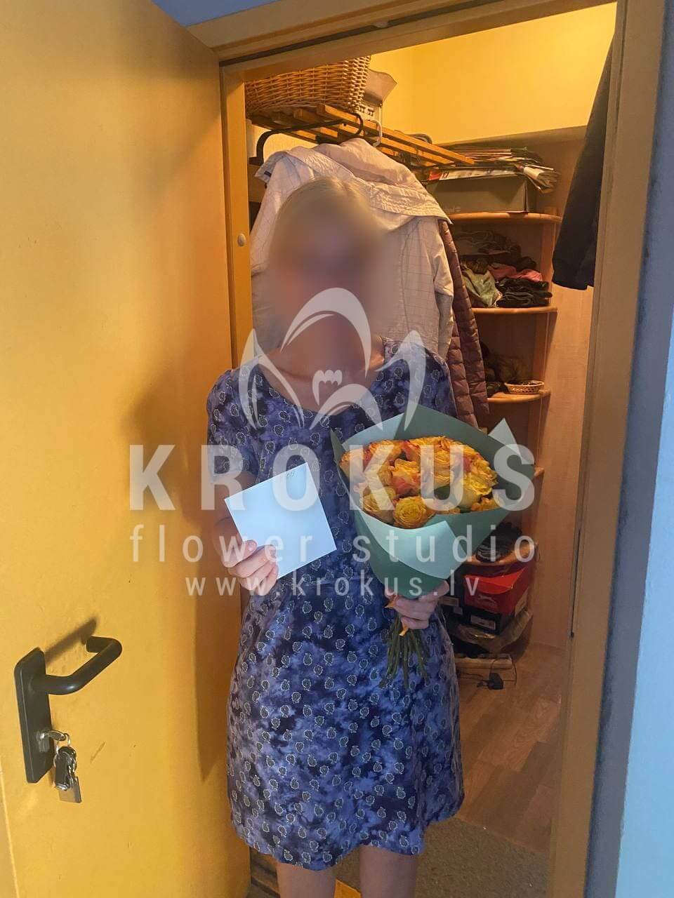 Mēs piegādājām vēl vienu pasūtījumu uz pilsētu Rīga. Pasūtītājs vēlējās: Ziedu piegāde Dzeltenas rozes 50см