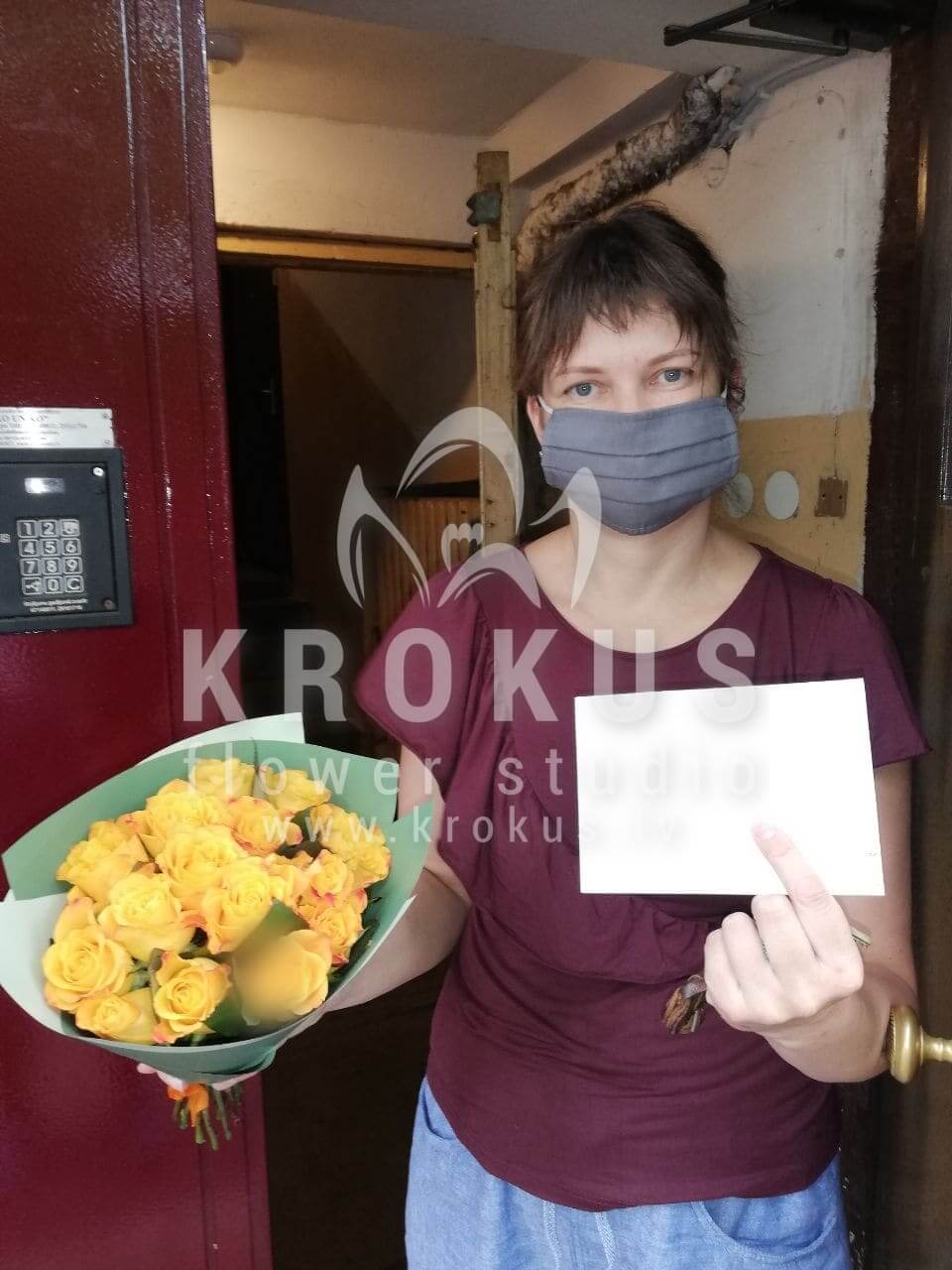 Mēs piegādājām vēl vienu pasūtījumu uz pilsētu Rīga. Pasūtītājs vēlējās: Ziedu piegāde Dzeltenas rozes 50см