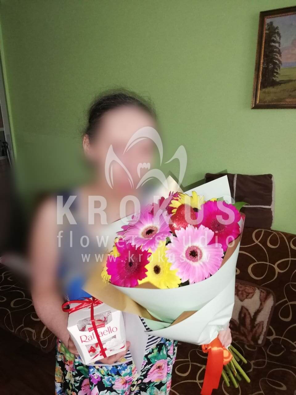 Mēs piegādājām vēl vienu pasūtījumu uz pilsētu Rīga. Pasūtītājs vēlējās: Ziedu piegāde Gerberu pušķis "Saulīte" (Kādu krāsu gerberas tik nav! Šiku ziedu pušķi mēs esam radījuši no dažādu krāsu gerberām. Sarkanām, rozā, oranžām, violetām un baltām. Šīs ir spilgtas, piesātinātas krāsas. Saulainā lente ir harmonijā ar pamata fona pušķi un saglabā savu eleganto tēlu. Jūtat pacilājošu garastāvokli? Un pasaule radīs varavīksni ap Jums!!!). Ziedu piegāde Raffaello 150g (Konfektes RAFFAELLO, 150g