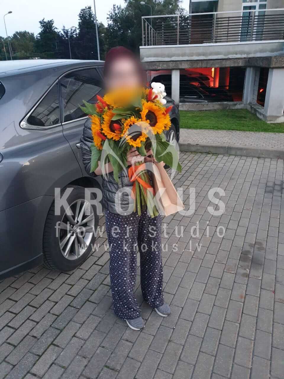 Mēs piegādājām vēl vienu pasūtījumu uz pilsētu Rīga. Pasūtītājs vēlējās: Ziedu piegāde Pušķis no saulespuķēm (Pušķa sastāvs var nedaudz atšķirties no attēlā redzamā, atkarībā no sezonas!). Ziedu piegāde Love is… 100gab. (Košļājamā gumija LOVE IS, 100gab.