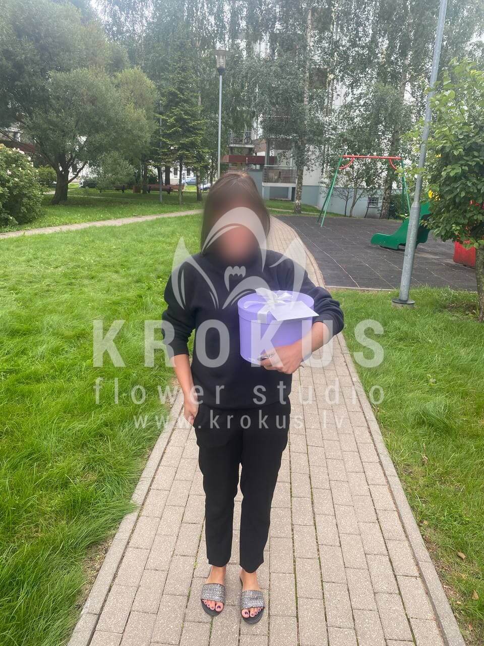 Mēs piegādājām vēl vienu pasūtījumu uz pilsētu Rīga. Pasūtītājs vēlējās: Ziedu piegāde Flowerbox ar macarooniem (Izmērs: