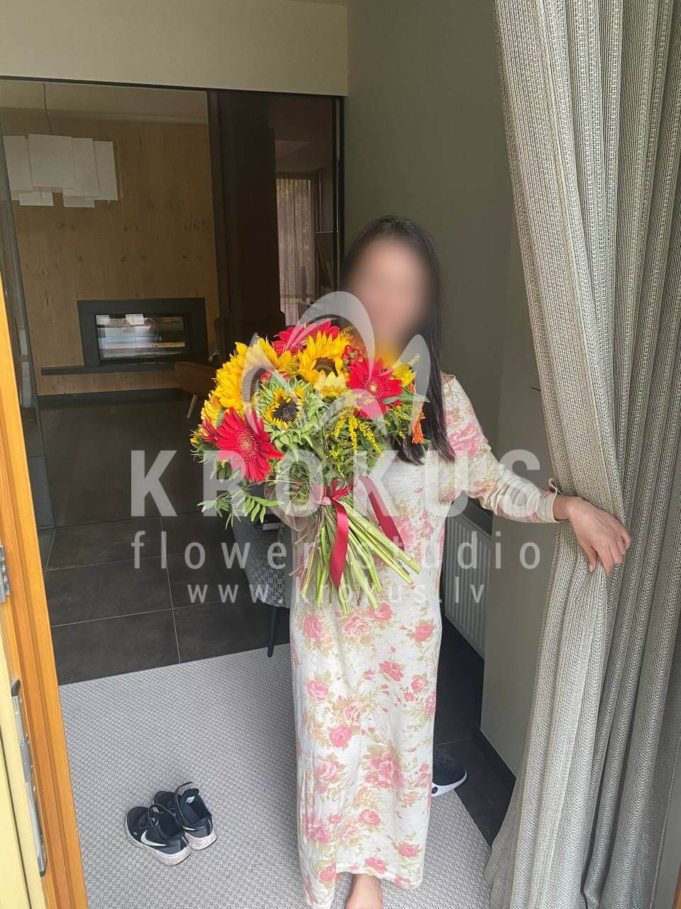 Ziedu sastāvā: Saulespuķes, Gerberas, Solidago, Hypericum, Ruskuss, Pļavas puķes.