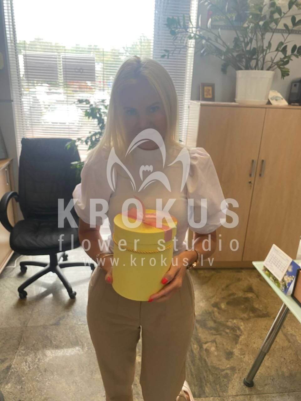 Mēs piegādājām vēl vienu pasūtījumu uz pilsētu Rīga. Pasūtītājs vēlējās: Ziedu piegāde Flowerbox ar macarooniem (Izmērs:
