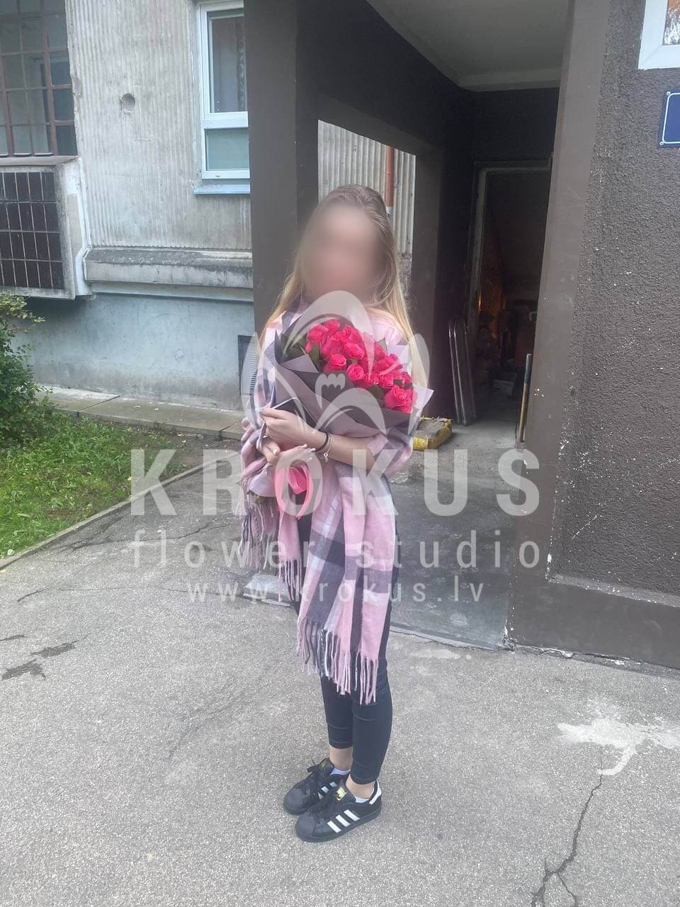Mēs piegādājām vēl vienu pasūtījumu uz pilsētu Rīga. Pasūtītājs vēlējās: Ziedu piegāde Aveņkrāsas rozes 50см