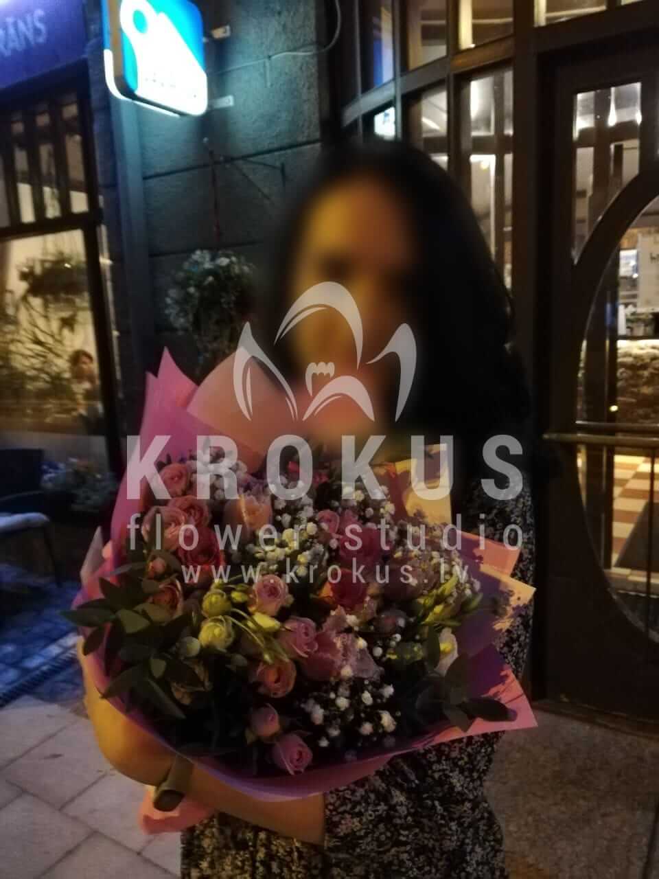 Ziedu sastāvā: Rozā rozes, Krūmrozes, Lizantes, Veronika, Tulpes, Gypsophila (Ģipsene), Ruskuss.