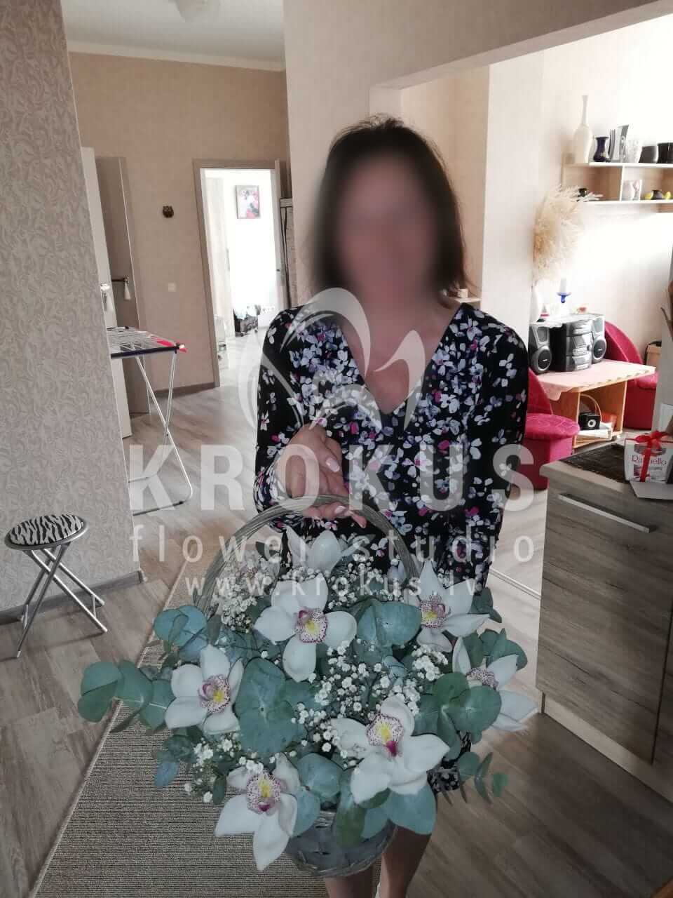 Ziedu sastāvā: Orhidejas, Gypsophila (Ģipsene), Eikalipts.