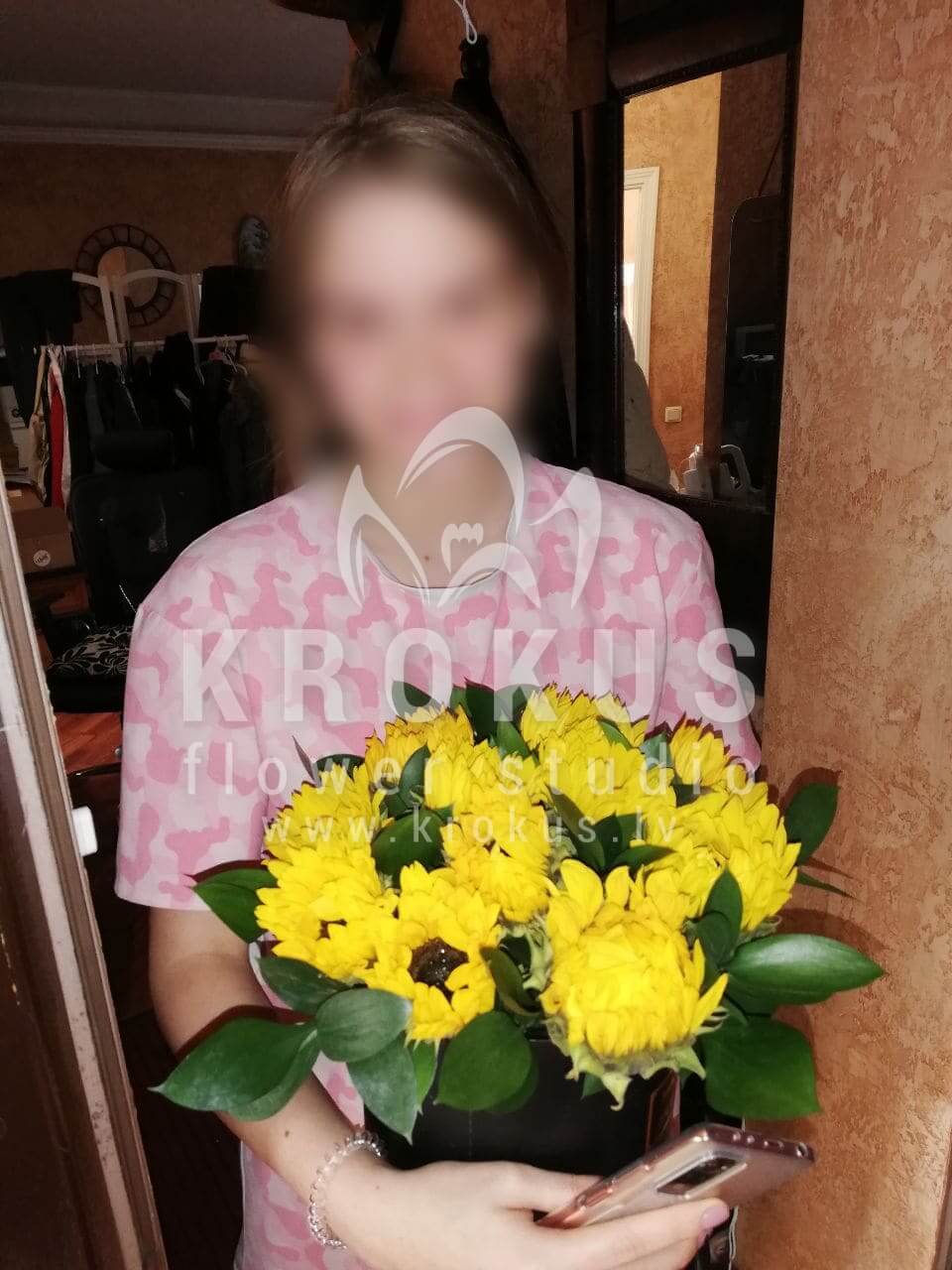 Ziedu sastāvā: Saulespuķes, Aspidistra.