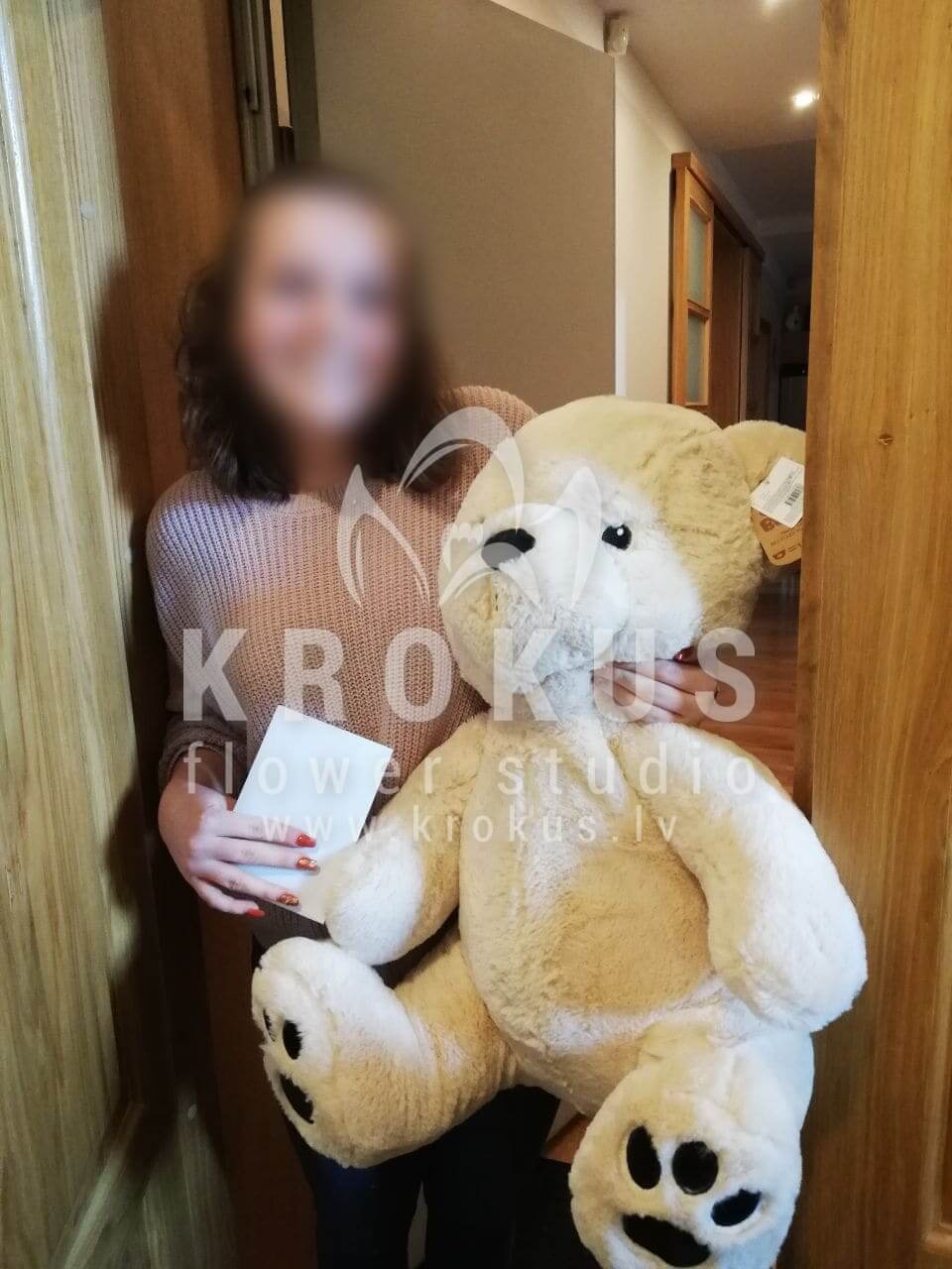 Mēs piegādājām vēl vienu pasūtījumu uz pilsētu Rīga. Pasūtītājs vēlējās: Ziedu piegāde Plīšu lācis 60cm