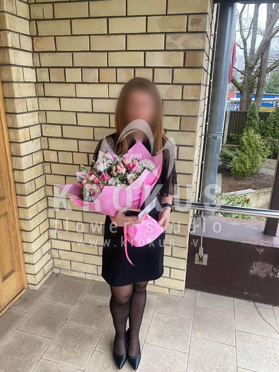 Ziedu sastāvā: Rozā rozes, Krūmrozes, Lizantes, Veronika, Tulpes, Gypsophila (Ģipsene), Ruskuss.