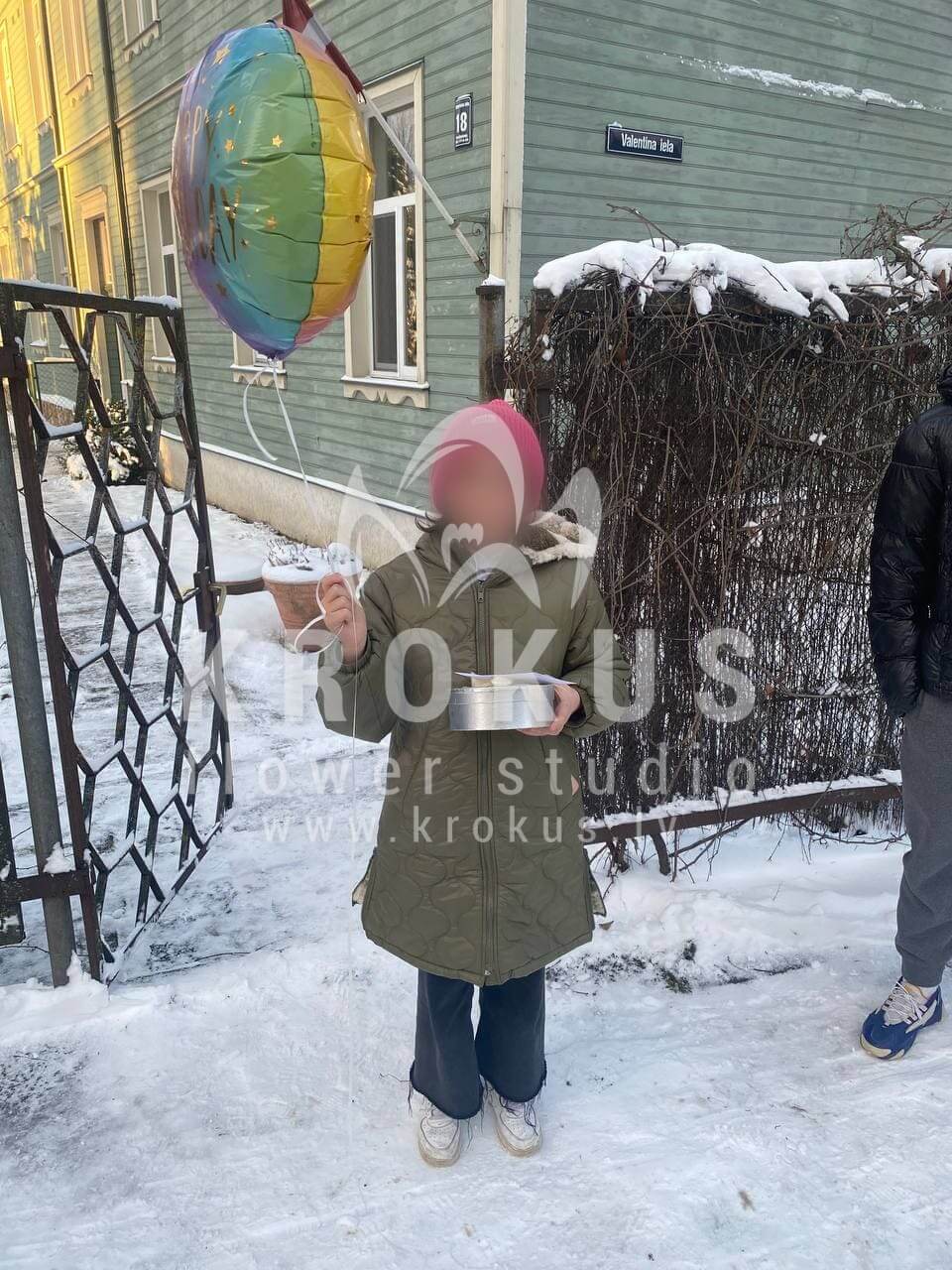 Mēs piegādājām vēl vienu pasūtījumu uz pilsētu Rīga. Pasūtītājs vēlējās: Ziedu piegāde Kastīte ar saldumiem. Ziedu piegāde Follija balons Daudz Laimes46cm