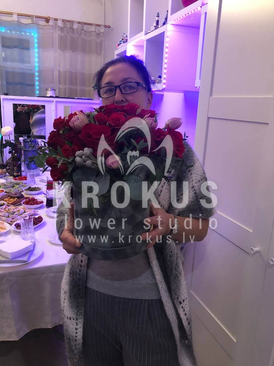 Ziedu sastāvā: Sarkanas rozes, Peonveidīgas tulpes, Brunija, Eikalipts, Salal (Goltjēra), KASTE.