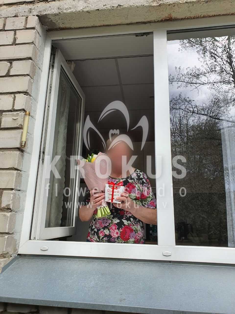 Mēs piegādājām vēl vienu pasūtījumu uz pilsētu Rīga. Pasūtītājs vēlējās: Ziedu piegāde baltās un dzeltenās tulpes. Ziedu piegāde Raffaello 150g (Konfektes RAFFAELLO, 150g