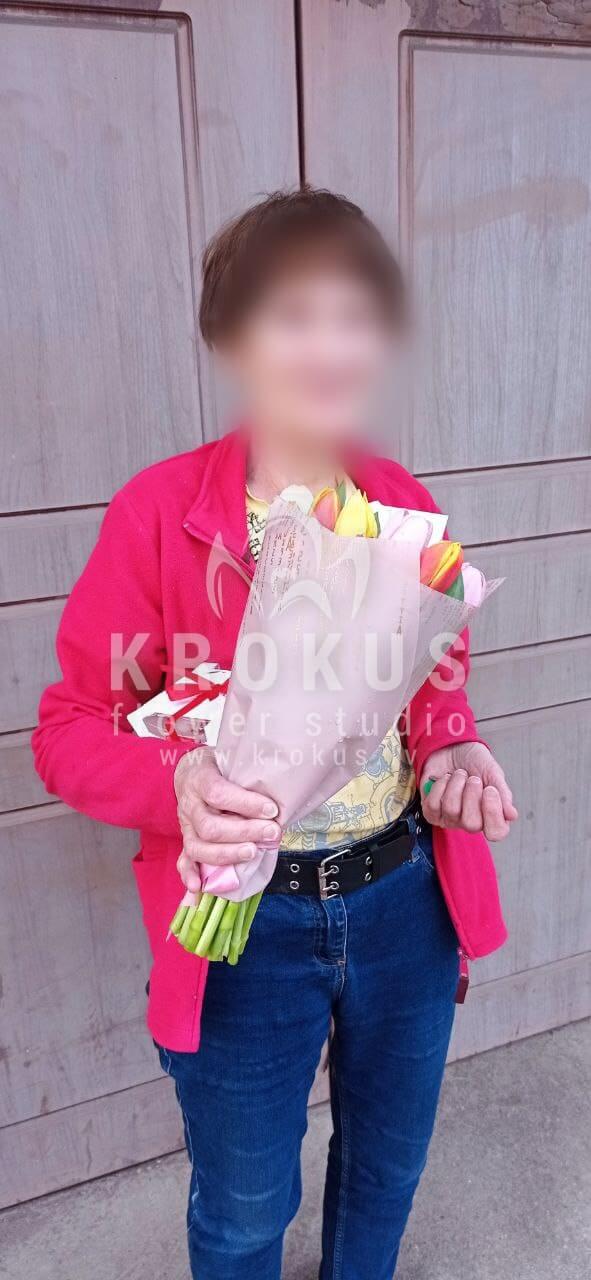 Mēs piegādājām vēl vienu pasūtījumu uz pilsētu Rīga. Pasūtītājs vēlējās: Ziedu piegāde Krāsainu tulpju pušķis. Ziedu piegāde Raffaello 150g (Konfektes RAFFAELLO, 150g