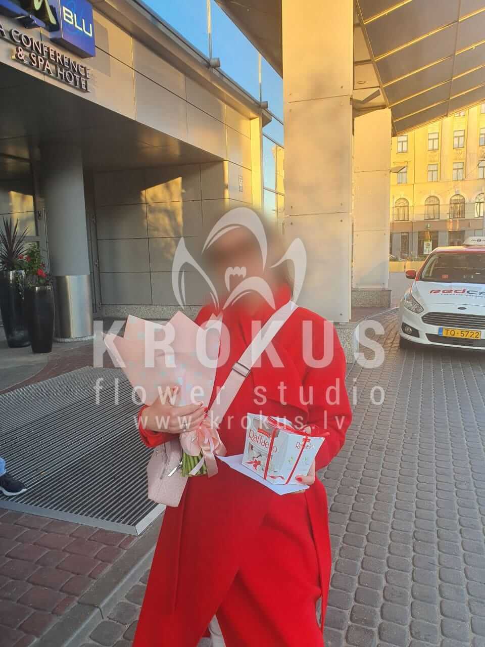 Mēs piegādājām vēl vienu pasūtījumu uz pilsētu Rīga. Pasūtītājs vēlējās: Ziedu piegāde Koraļļu krāsas peonijas. Ziedu piegāde Raffaello 150g (Konfektes RAFFAELLO, 150g