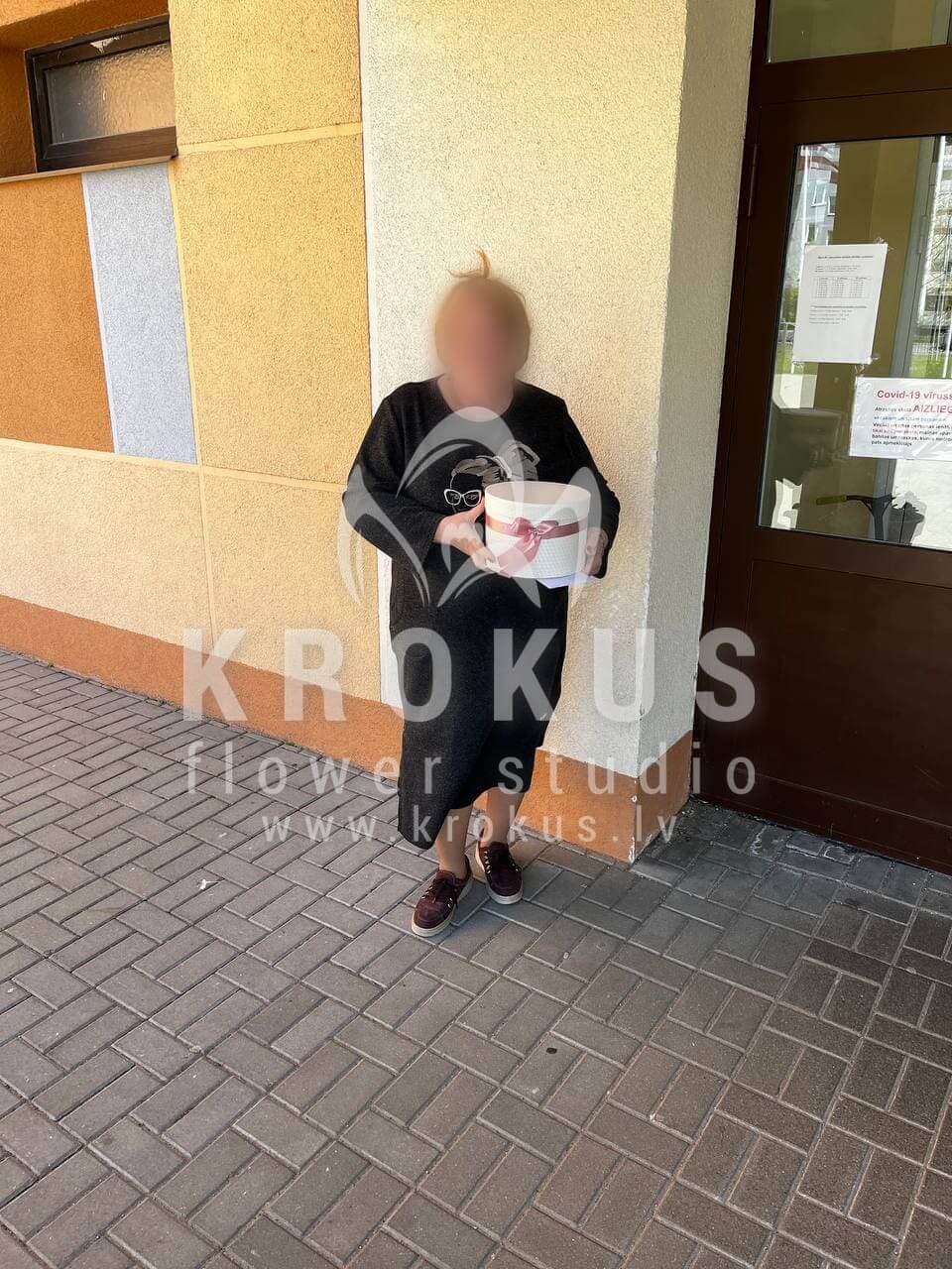 Mēs piegādājām vēl vienu pasūtījumu uz pilsētu Rīga. Pasūtītājs vēlējās: Ziedu piegāde Flowerbox ar macarooniem (Izmērs: