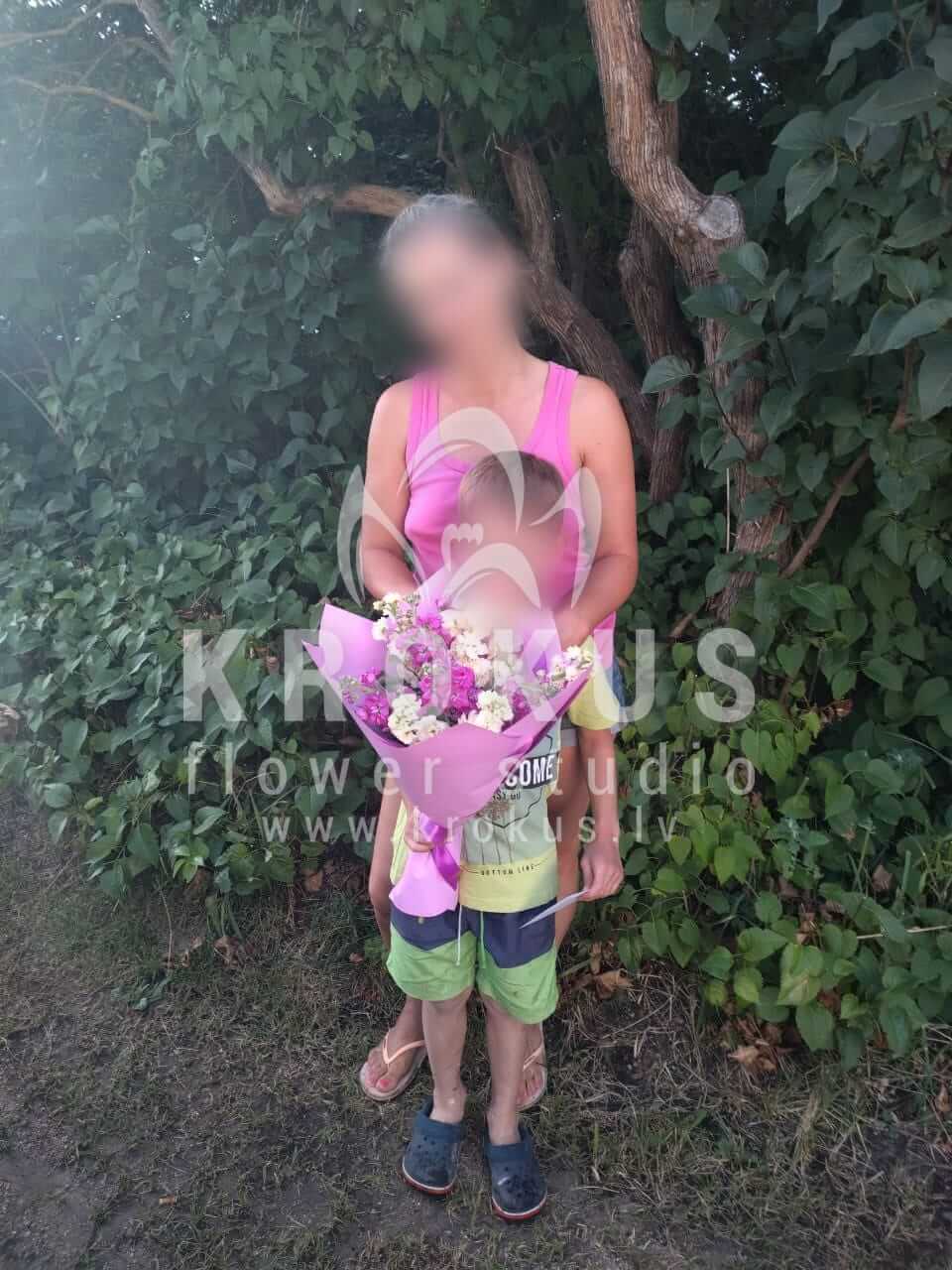 Mēs piegādājām vēl vienu pasūtījumu uz pilsētu Rīga. Pasūtītājs vēlējās: Ziedu piegāde Aromātisks pušķis no lefkojas