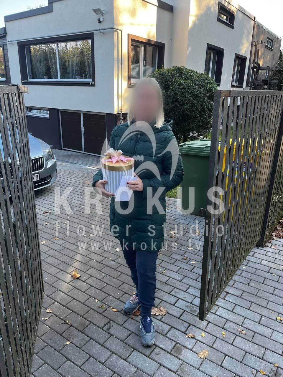 Mēs piegādājām vēl vienu pasūtījumu uz pilsētu Rīga. Pasūtītājs vēlējās: Ziedu piegāde Flowerbox ar macarooniem (Izmērs: