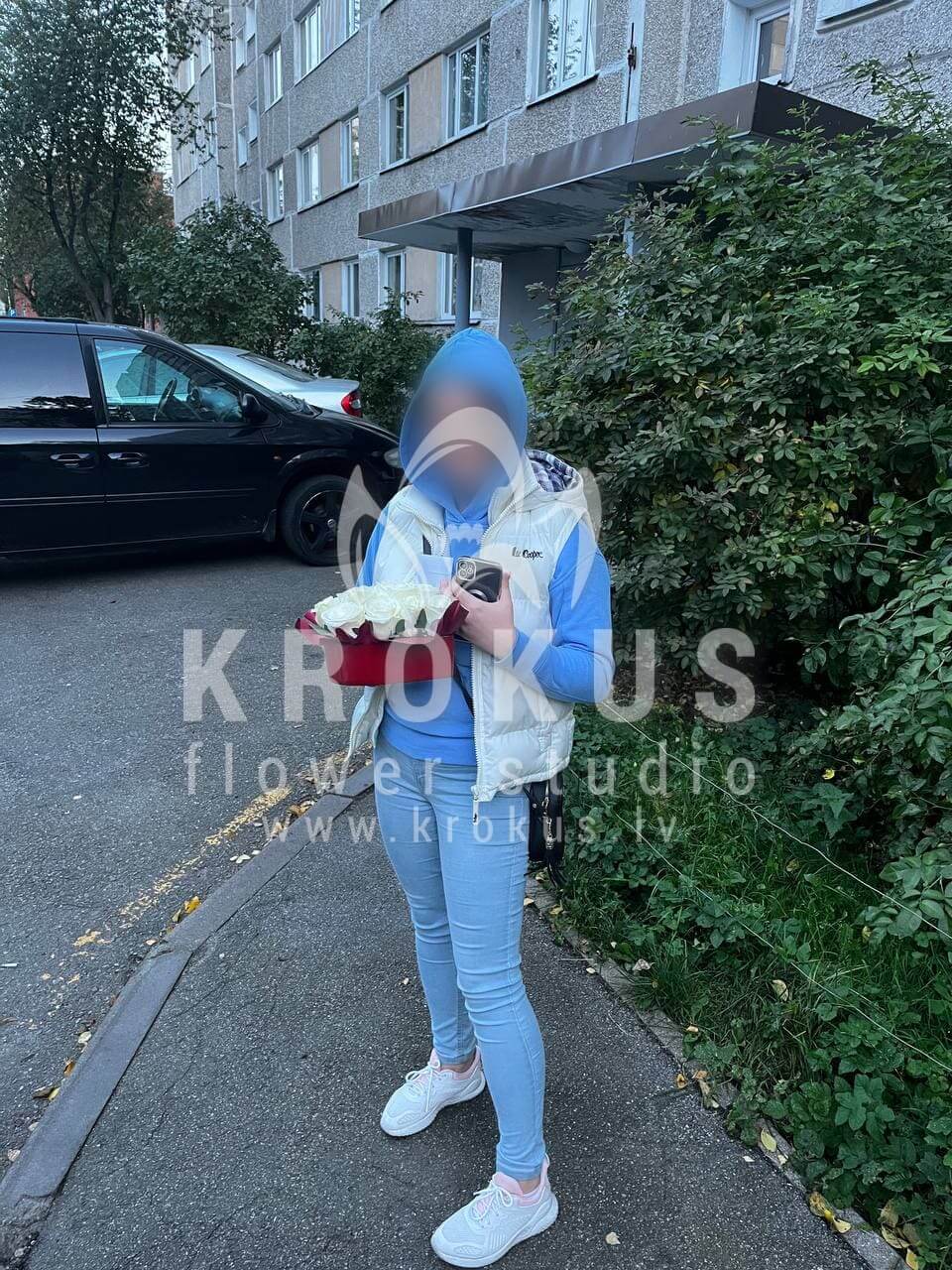Ziedu sastāvā: Baltas rozes, Stilīga kastīte.
