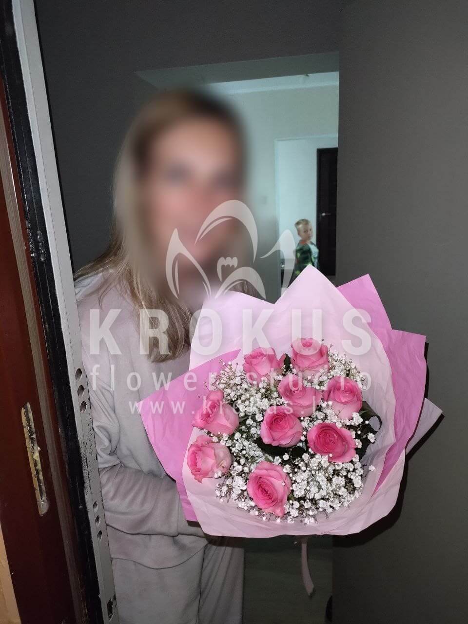 Ziedu sastāvā: Rozā rozes, Gypsophila (Ģipsene).