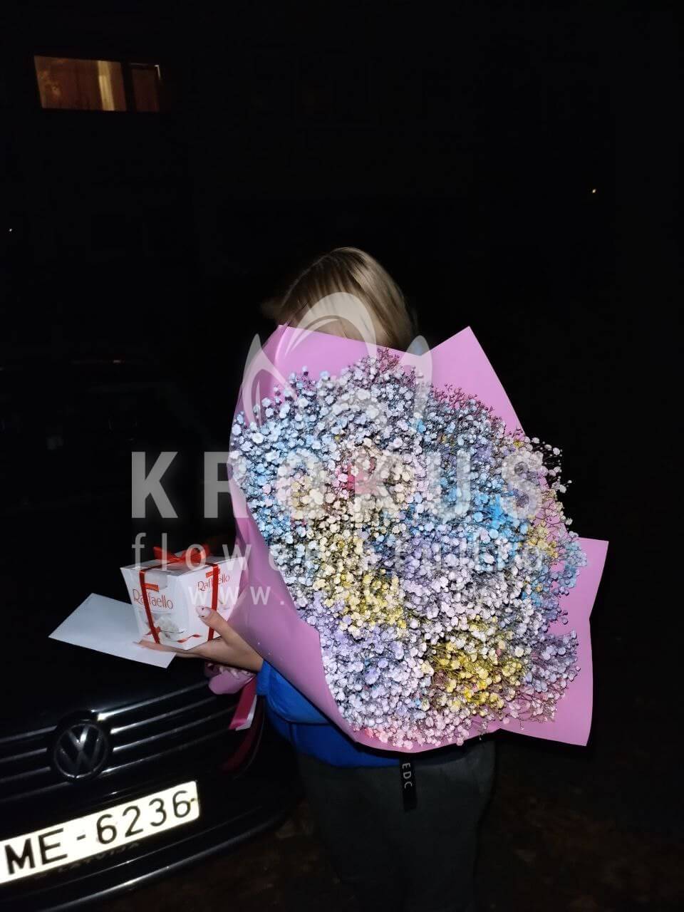 Mēs piegādājām vēl vienu pasūtījumu uz pilsētu Rīga. Pasūtītājs vēlējās: Ziedu piegāde Varavīksnes krāsu gipsofila. Ziedu piegāde Raffaello 150g (Konfektes RAFFAELLO, 150g