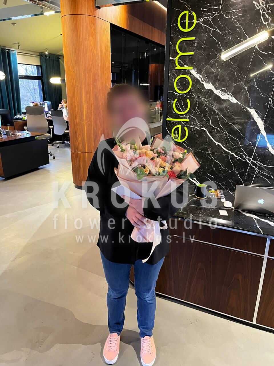 Ziedu sastāvā: Krūmrozes, Lizantes, Neļķes, Peonveidīgās rozes, Eikalipts.