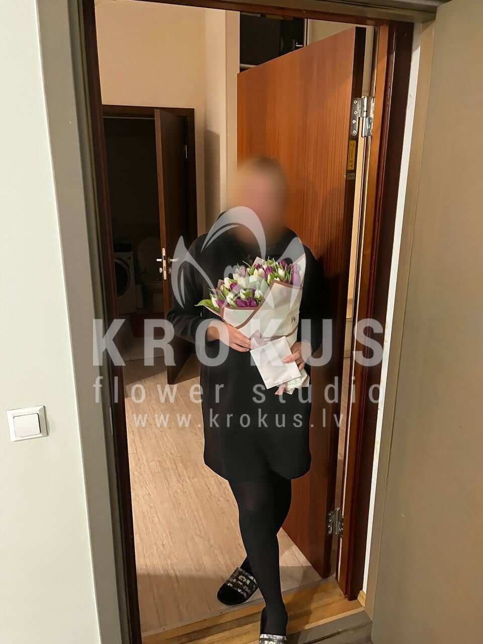 Mēs piegādājām vēl vienu pasūtījumu uz pilsētu Rīga. Pasūtītājs vēlējās: Ziedu piegāde Balto un violeto tulpju pušķis
