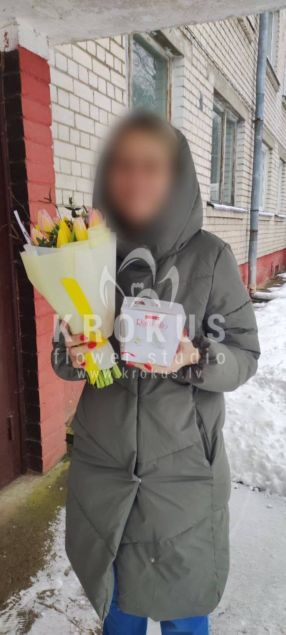 Mēs piegādājām vēl vienu pasūtījumu uz pilsētu Rīga. Pasūtītājs vēlējās: Ziedu piegāde Pavasaris pušķī. Ziedu piegāde Raffaello 150g (Konfektes RAFFAELLO, 150g