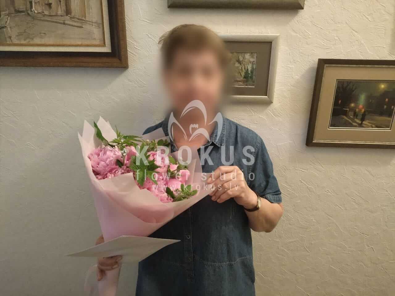 Mēs piegādājām vēl vienu pasūtījumu uz pilsētu Rīga. Pasūtītājs vēlējās: Ziedu piegāde Baltas peonijas ar neaizmirstulītēm