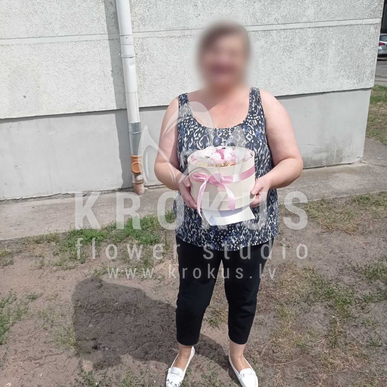 Mēs piegādājām vēl vienu pasūtījumu uz pilsētu Rīga. Pasūtītājs vēlējās: Ziedu piegāde Flowerbox ar macarooniem (Izmērs: