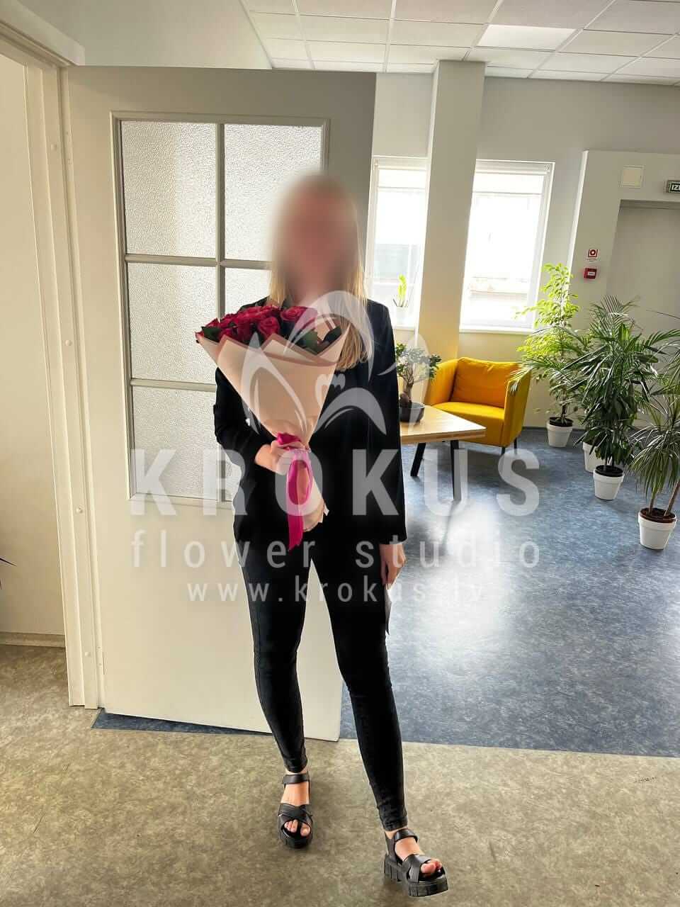Mēs piegādājām vēl vienu pasūtījumu uz pilsētu Rīga. Pasūtītājs vēlējās: Ziedu piegāde Aveņkrāsas rozes 50см