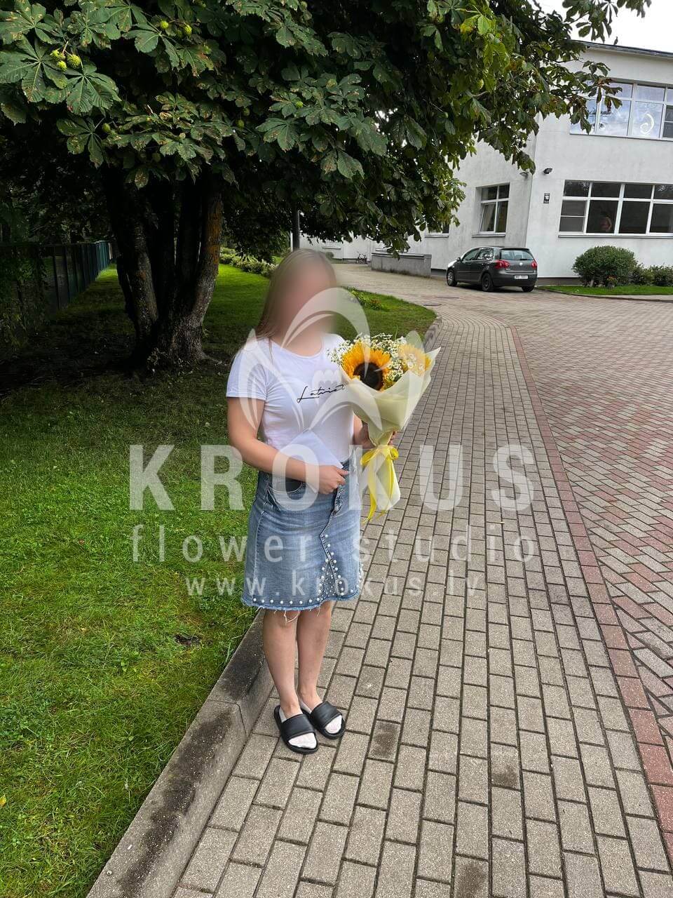 Ziedu sastāvā: Margrietiņas, Saulespuķes, Limonija, Bergrass, Pistācija, Salal (Goltjēra).