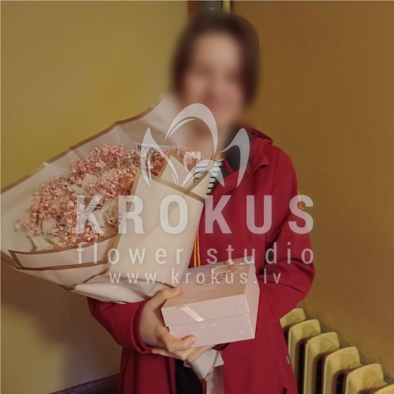 Ziedu sastāvā: Gypsophila (Ģipsene), Orhidejas.