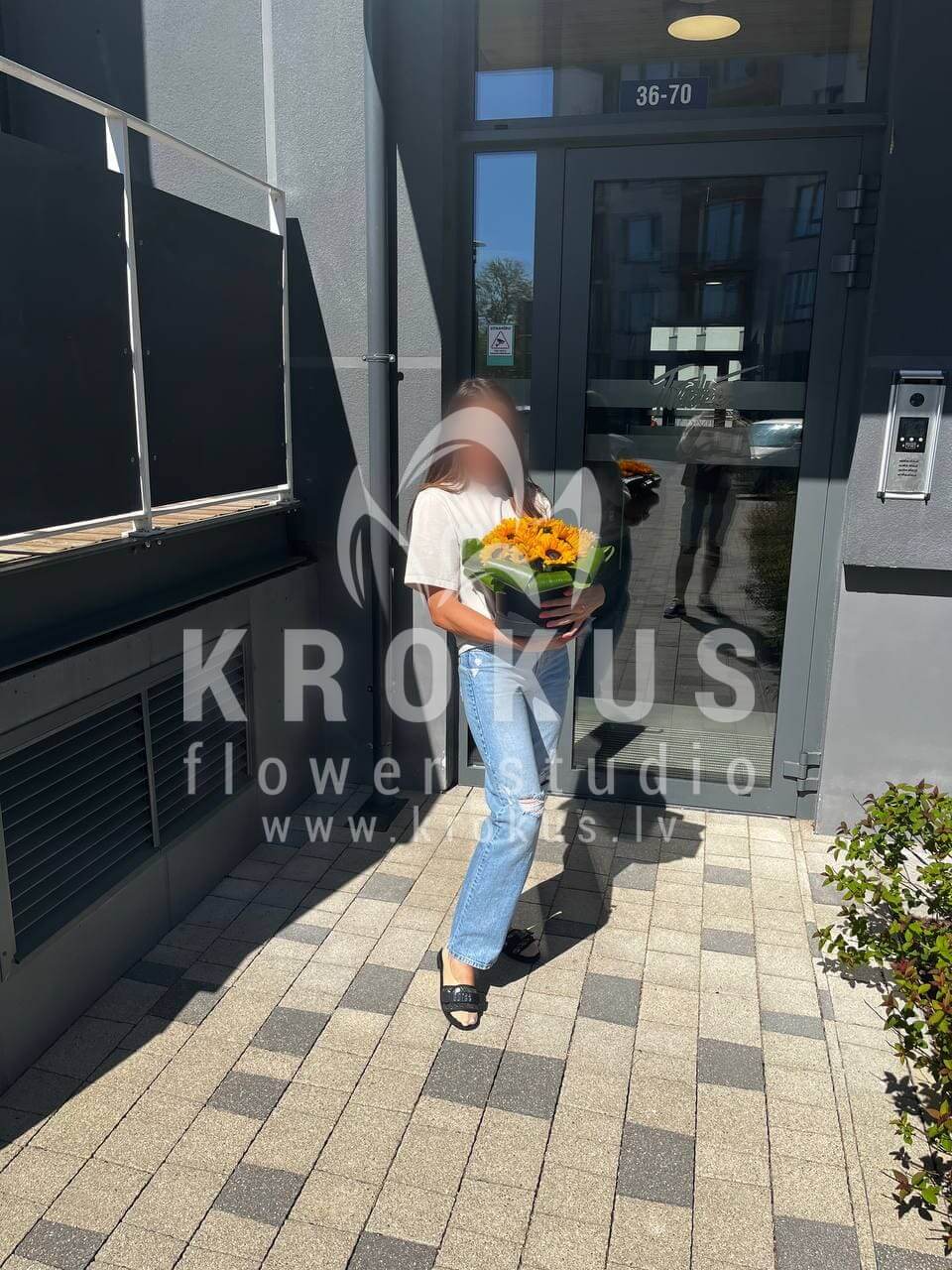 Ziedu sastāvā: Saulespuķes, Aspidistra.