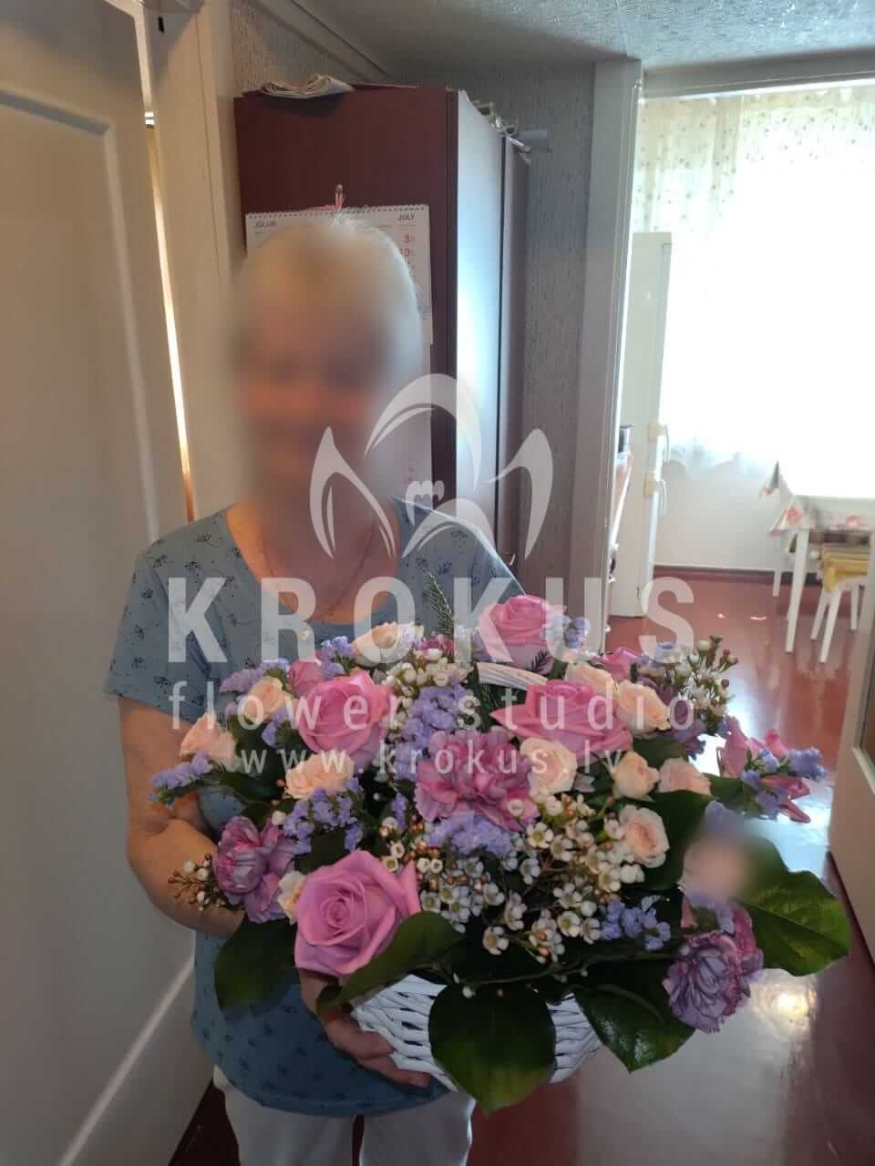 Ziedu sastāvā: Neļķes, Krūmrozes, Rozā rozes, Statice, Waxflower, Salal (Goltjēra).