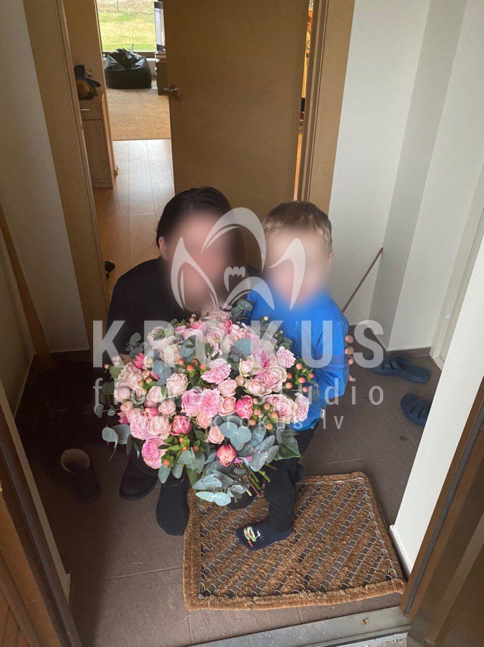 Ziedu sastāvā: Rozā rozes, Krūmrozes, Peonveidīgās rozes, Hypericum, Tulpes, Neļķes, Eikalipts, Pistācija.