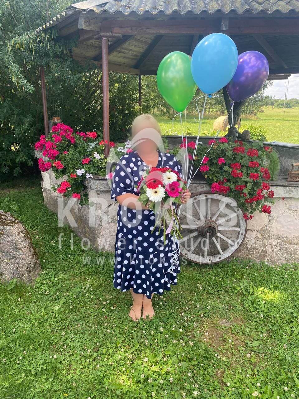 Mēs piegādājām vēl vienu pasūtījumu uz pilsētu Tīnūži. Pasūtītājs vēlējās: Ziedu piegāde Gerberu pušķis "Saulīte" (Kādu krāsu gerberas tik nav! Šiku ziedu pušķi mēs esam radījuši no dažādu krāsu gerberām. Sarkanām, rozā, oranžām, violetām un baltām. Šīs ir spilgtas, piesātinātas krāsas. Saulainā lente ir harmonijā ar pamata fona pušķi un saglabā savu eleganto tēlu. Jūtat pacilājošu garastāvokli? Un pasaule radīs varavīksni ap Jums!!!). Ziedu piegāde Hēlija baloni asortimentā (cena par 1 gab)
